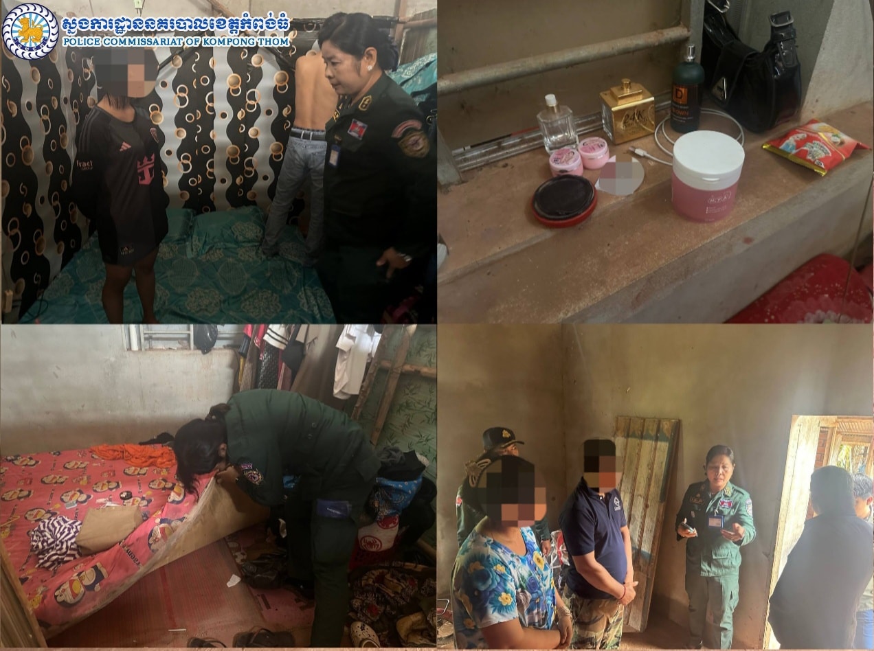 ខេត្តកំពង់ធំ ៖ អនុវត្តតាមការចង្អុលដឹកនាំដ៏ខ្ពង់ខ្ពស់របស់ឯកឧត្ដម នាយឧត្ដមសេនីយ៍ ស ថេត អគ្គស្នងការនគរបាលជាតិ ក្រោមការបញ្ជាដឹកនាំពីលោកឧត្ដមសេនីយ៍ទោ ហេង សុផល ស្នងការនគរបាលខេត្ត និងមានការសម្របសម្រួលពីលោក ពៅ សម្បូរណ៍ ព្រះរាជអាជ្ញារងនៃអយ្យការអមសាលាដំបូងខេត្តកំពង់ធំ កាលពីថ្ងៃទី ១៧ ខែ សីហា ឆ្នាំ២០២៥ វេលាម៉ោង ១៤ និង ០០នាទី លោកស្រីឧត្ដមសេនីយ៍ត្រី កង កូយ ស្នងការរង ផែនការងារប្រឆាំងការជួញដូរមនុស្ស នឹងយេនឌ័រ បានដឹកនាំកម្លាំងការិយាល័យប្រឆាំងការជូញដូរមនុស្សនិងការពារអនីតិជន ចុះបង្ក្រាបករណី សញ្ចរកម្ម ០១ ករណី ជ្រកក្រោមស្លាកយីហោ ហាងស៊ុបមួយកន្លែង ដែលមានទីតាំង ស្ថិតក្នុងភូមិ ត្រពាំងឬស្សី ឃុំ ក្រយា ស្រុក សន្ទុកខេត្តកំពង់ធំ ។