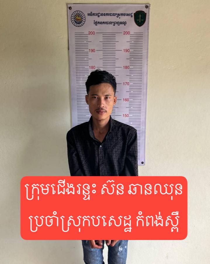 កំពង់ស្ពឺ៖ ដោយអនុវត្ដតាមការដឹកនាំបញ្ជាដ៏ខ្ពង់ខ្ពស់ពីលោកឧត្ដមសេនីយ៍ទោ ឃឹម សុកខៃ ស្នងការនគរបាលខេត្ដកំពង់ស្ពឺ នារសៀលថ្ងៃចន្ទ ៩រោច ខែស្រាពណ៍ ឆ្នាំម្សាញ់ សប្តស័ក ព.ស. ២៥៦៩ ត្រូវនឹង ថ្ងៃទី១៨ ខែសីហា ឆ្នាំ២០២៥ កំលាំងអធិការដ្ឋាននគរបាលស្រុកបសេដ្ឋ លោកវរសេនីយ៍ឯក ចន សុភិត អធិការនគរបាលស្រុកបសេដ្ឋ បញ្ជាអោយកំលាំងផ្នែកនគរបាលព្រហ្មទណ្ឌស្រុកធ្វេីការស្រាវជ្រាវករណីកំហែងយកដោយជនសង្ស័យជិះកង់មកធាក់ជនរងគ្រោះធ្លាក់ពីលេីម៉ូតូ ម៉ាកហុងដា C125 ពណ៍ខ្មៅ សេរីឆ្នាំ២០២២ ពាក់ផ្លាកលេខកំពង់ស្ពឺ 1V-0897 រួចយកម៉ូតូជិះរត់គេចភ្លាមៗបន្ទាប់ពីធ្វេីសកម្មភាពរួច នៅចំណុចមាត់ស្រះទឹក ស្ថិតក្នុងភូមិព្រៃត្បែង ឃុំពោធិចំរើន ស្រុកបសេដ្ឋ ខេត្តកំពង់ស្ពឺ ។