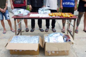(បន្ទាយមានជ័យ): នៅវេលាម៉ោង១១និង០០នាទីថ្ងៃទី១៨ ខែមេសា ឆ្នាំ២០២៦ កម្លាំងជំនាញមូលដ្ឋានកងរាជអាវុធហត្ថក្រុងប៉ោយប៉ែតបានទទួលបណ្ដឹងពីជនរងគ្រោះឈ្មោះ ឡា តុងញ៉ា (LA TRONG NHAN) ភេទប្រុស អាយុ២១ឆ្នាំ ជនជាតិវៀតណាម ស្តីពីករណី ហិង្សាដោយចេតនា(មានស្ថានទម្ងន់ទោស) ប្រព្រឹត្តកាលពីវេលាម៉ោង១៦និង៣៥នាទី ថ្ងៃទី១៦ ខែមេសា ឆ្នាំ២០២៦ នៅតាមបណ្តោយផ្លូវមួយកន្លែង ស្ថិតក្នុងភូមិបាលិលេយ្យ២ សង្កាត់ប៉ោយប៉ែត ក្រុងប៉ោយប៉ែត ខេត្តបន្ទាយមានជ័យ។ ក្រោយពីបានទទួលពាក្យបណ្តឹងរួចលោកអនុសេនីយ៍ឯក តិល តៃលីវ មេបញ្ជាការមូលដ្ឋានកងរាជអាវុធហត្ថក្រុងបានដឹកនាំកម្លាំងជំនាញចុះធ្វើការស្រាវជ្រាវកំណត់មុខសញ្ញារហូតដល់វេលាម៉ោង១៤និង៣០នាទី ថ្ងៃទី១៩ ខែមេសា ឆ្នាំ២០២៦ ឃាត់ខ្លួនជនសង្ស័យជាជនជាតិវៀតណាមចំនួន០៦នាក់ នៅចំណុចផ្ទះល្វែងមួយកន្លែង ស្ថិតក្នុងភូមិមិត្តភាព សង្កាត់ប៉ោយប៉ែត ក្រុងប៉ោយប៉ែត ១.ឈ្មោះ វង ទុងកេក (NGUYEN TUANKIET) ភេទប្រុស អាយុ២៦ឆ្នាំ, ២.ឈ្មោះ វែង ថឹងបិន (VENG TEINGBEN) ភេទប្រុស អាយុ២២ឆ្នាំ, ៣.ឈ្មោះ ឡេ យ៉ាំងវ៉ឹក ភេទប្រុស អាយុ២៤ឆ្នាំ, ៤.ឈ្មោះ ជឿង ខាន់តុង(TRUONG THANH TUNG) ហៅហ្វី ភេទប្រុស អាយុ២៣ឆ្នាំ, ៥.ឈ្មោះ វែង តឹងតាយ ភេទប្រុស អាយុ២៥ឆ្នាំ, ៦.ឈ្មោះ ប៊ូយ វ៉ឹកខាន់ ភេទប្រុស អាយុ២៣ឆ្នាំ ព្រមទាំងដកហូតវត្ថុតាង ៖ កាំបិតបត់ ប្រវែង២១សង់ទីម៉ែត្រ ចំនួន០១ដើម, ម្សៅម៉ត់ពណ៌សសង្ស័យជាសារធាតុផ្សំ ចំនួន៧៥កញ្ចប់, ថ្នាំគ្រាប់ពណ៍បៃតងJNW ចំនួន០១បន្ទះ ស្មើនឹង០៩គ្រាប់, បំពង់វែបចម្រុះ ចំនួន៥៦៤គ្រឿង, ក្បាលបំពង់វែប ចំនួន១៣ថង់ធំ, ម្សៅសប្បាយរូបសេះ ចំនួន៥៨កញ្ចប់, ទឹកថ្នាំពណ៌លឿង ចំនួន០៣បន្ទះ, ជញ្ចីងថ្លឹងគ្រឿងញៀន ចំនួន០២គ្រឿង, ម៉ាស៊ីនគៀបថង់សម្រាប់វេចខ្ចប់ ចំនួន០២គ្រឿង, ថង់វេចខ្ចប់មួយចំនួនធំ រួមនឹងវត្ថុតាងមួយចំនួនទៀត ហើយនាំមកកាន់មូលដ្ឋានមូលដ្ឋានកងរាជអាវុធហត្ថក្រុងប៉ោយប៉ែតដើម្បីសួរនាំតាមនីតិវិធី។