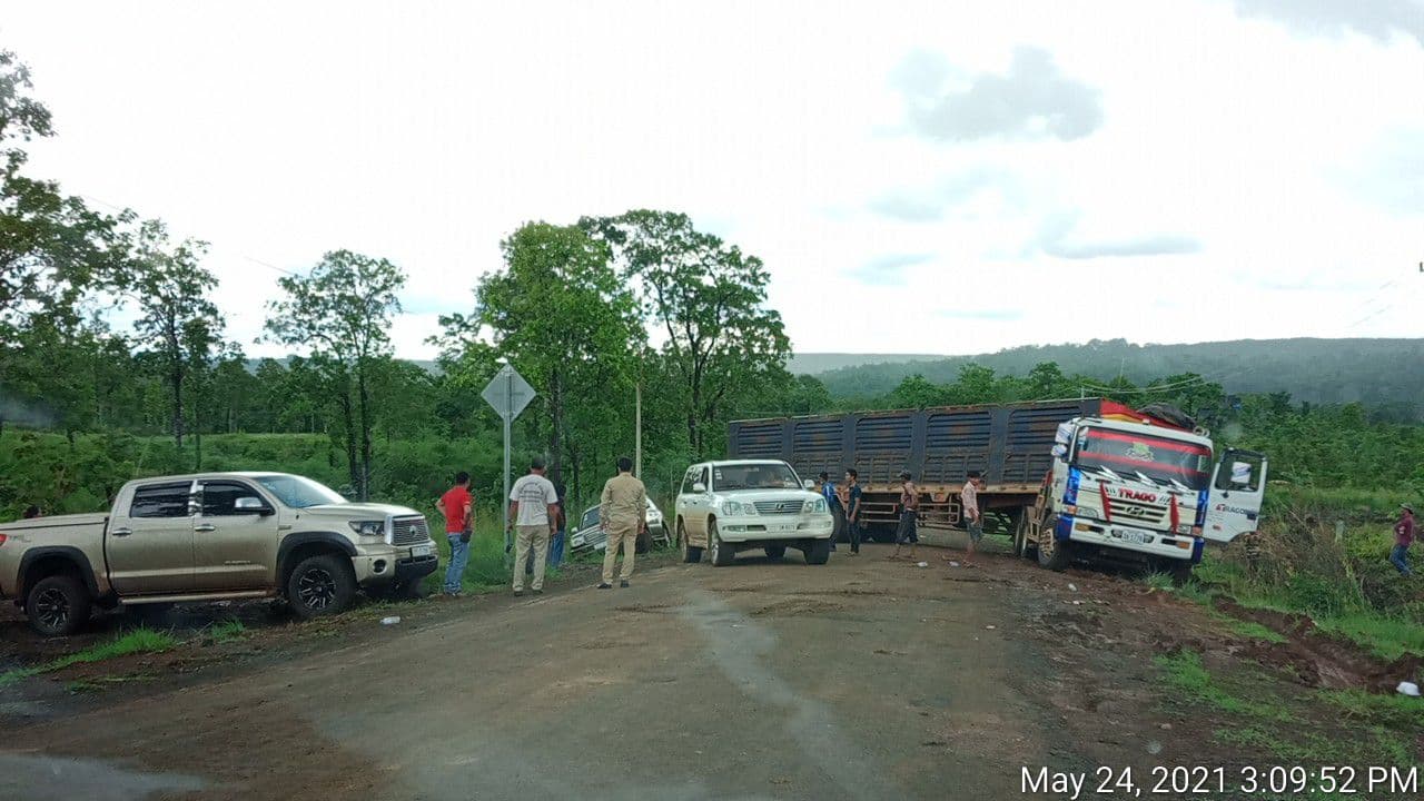 ស្រុកពេជ្រាដា ÷ នៅល្ងាចនាថ្ងៃទី២៤ ខែឧសភា ឆ្នាំ២០២១ វេលាម៉ោង ៣ និង០០នាទីមានឡានយុីឌុបពាក់ស្លាកលេខ ត្បូងឃ្មុំ ៣ A ១៧៧៨ ដឹកឥតបានឡើងត្រង់ចំណោតភ្នំអូរផ្លាយហើយឡើងទៅមិនរួចបានរអិលមកក្រោយដោយទទឹងលើទ្រូងផ្លូវចំត្រង់ចង្កេះភ្នំតែម្តងប៉ុន្តែមិនបង្កគ្រោះថ្នាក់ដល់អ្នកបើកបរនិងបងប្អូនប្រជាពលរដ្ឋនោះទេ?។