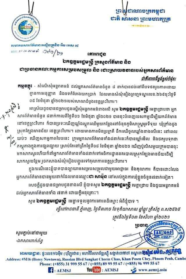 អ្នកកាសែត៨រូបមានស្រីប្រុស(ដោះលែង១រូបព្រោះភរិយាឈឺចិត្តគាំងបេះដូងត្រូវបានតុលាការខេត្តព្រះវិហារដែលមានចៅក្រមឈ្មោះ លោក ទីវ វិសាល និងព្រះរាជអាជ្ញារង ឈ្មោះលោក គឹម សំលេង ធ្វើការចោទចោទប្រកាន់ពី.បទកំហែងយក.និងបញ្ជូនខ្លួនទៅផ្ញើរនៅគុកបណ្តោះអាសន្ននាល្ងាចថ្ងៃទី០៦ ខែមិថុនា ឆ្នាំ២០២១ រងចាំការបើកសវនាការអង្គសេចក្តីមួយរយៈ។